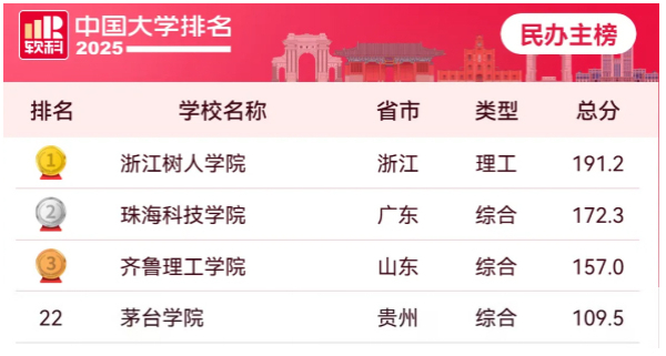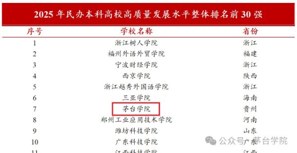 4月15日,高等教育专业评价机构软科正式发布的“2025软科中国大学排名”中,茅台学院在民办高校排名的主榜及总榜中均位列全国第22名,较2024年上升了7个名次,在贵州民办高校中排第1名。