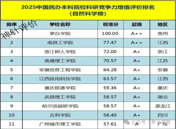 6月9日,在神针评价(SZPJ)发布的“2025年中国民办本科院校科研竞争力排名”中,茅台学院在380所民办本科院校中实力显现。排名显示,茅台学院在2025年中国民办本科院校科研竞争力增值评价(自然科学榜)居于榜首(排名第1),科研竞争力实力(自然科学榜)排名第3,评级均为A++。此外,茅台学院还成功入选2025年自然科学榜最佳科研生态位民办本科院校名单。