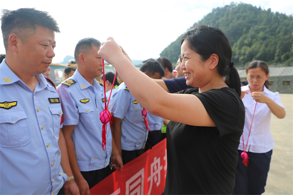 她们举着“千里驰援显大爱,携手同心护榕江”字样的横幅,提着亲手编制的红蛋,挂在救援人员的肩头,那一枚枚红蛋,承载着最真挚的祝福与情谊。
