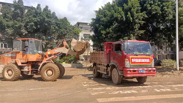 7月2日至今,洪水退去,榕江全力转入灾后重建阶段,各方救援力量转而进行清障、清淤、消杀等工作,帮助当地逐步恢复生产生活秩序。贵州高速集团“贵州高速先锋”支援榕江抢险救援队并没有离开,而是派出此时当地最需要的洒水车、清扫车继续开展工作。