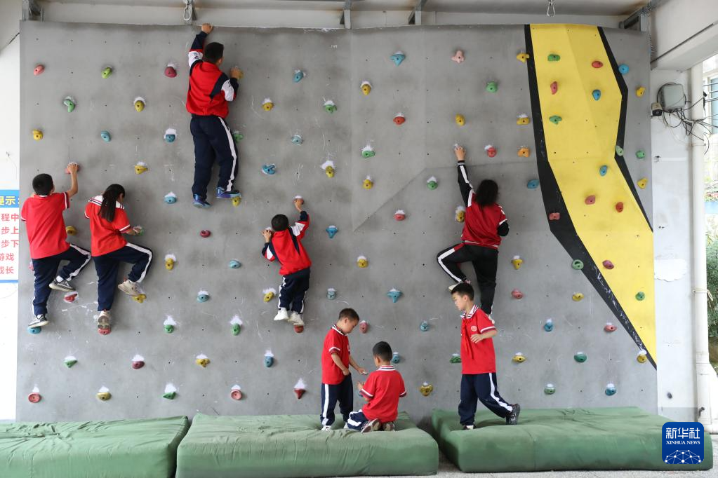 6月4日,贵州省黄平县新州镇第二小学的学生课间在学校的攀岩墙攀岩。新华社记者 郑明鸿 摄
