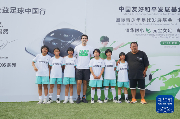 元宝女足队员与著名球星卡卡(左四)合影。受访者供图
