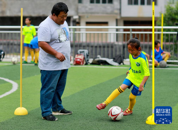 徐召伟(左)在指导元宝小学足球队队员练习(2019年5月29日摄)。新华社记者 欧东衢 摄