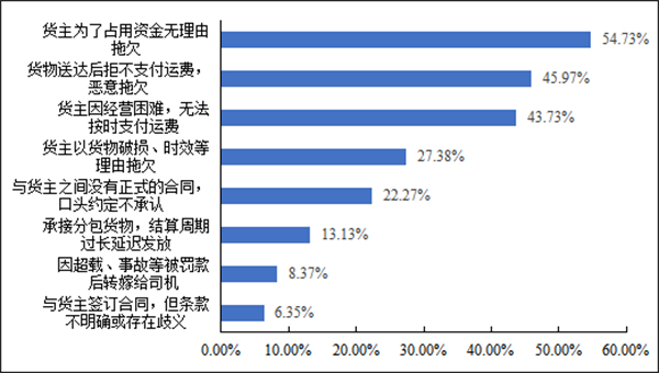 此外,因货损、时效问题扯皮而导致的运费拖欠、因合同缺失导致的运费拖欠、因超载超限或出现事故等被罚款或出现损失转嫁司机导致的运费拖欠等问题也较为常见。