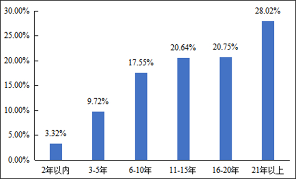 《报告》显示,从业年限在21年以上的货车司机占比最高,达28.02%。其次是从业年限在11-15年、16-20年的司机占比分别为20.64%和20.75%。三者合计,从业年限在11年以上的货车司机占比69.41%,接近七成,显示货车司机职业稳定性较高。