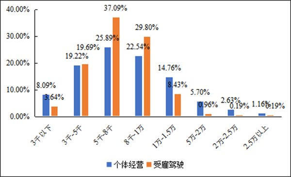 《报告》显示,货车司机月均收入集中在5000-8000元,在蓝领群体中处于中等偏上水平。受雇驾驶货车司机的收入在5000-10000元占比达66.89%,个体经营司机的收入在5000-10000元占比达63.19%。高收入水平的个体经营司机占比更多,10000元以上个体经营司机,占比24.25%。