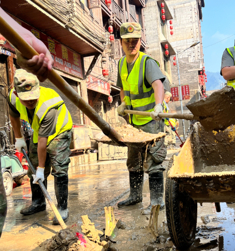 抵达榕江灾区时,街道积水齐腰,淤泥没过小腿,满目疮痍的景象刺痛着每个人的心。“我是老兵,让我上!”石威远主动请缨冲向最艰险的区域。从6月24日到7月8日,他的身影始终出现在淤泥最深、气味最刺鼻的清理现场:在齐腰深的水中搬运救灾物资,在塌方路段徒手清除石块瓦砾,在废墟间帮受灾群众转移家当。连续工作12小时以上成了常态,汗水混着泥浆浸透衣背,他抹把脸继续干;手掌磨出水泡,简单包扎后又握紧铁锹。那双曾在军营磨砺的臂膀,此刻化作最坚实的依靠,肩挑背扛间,为受灾群众犁出一条条重返家园的通路。