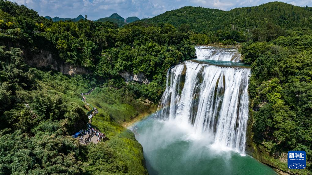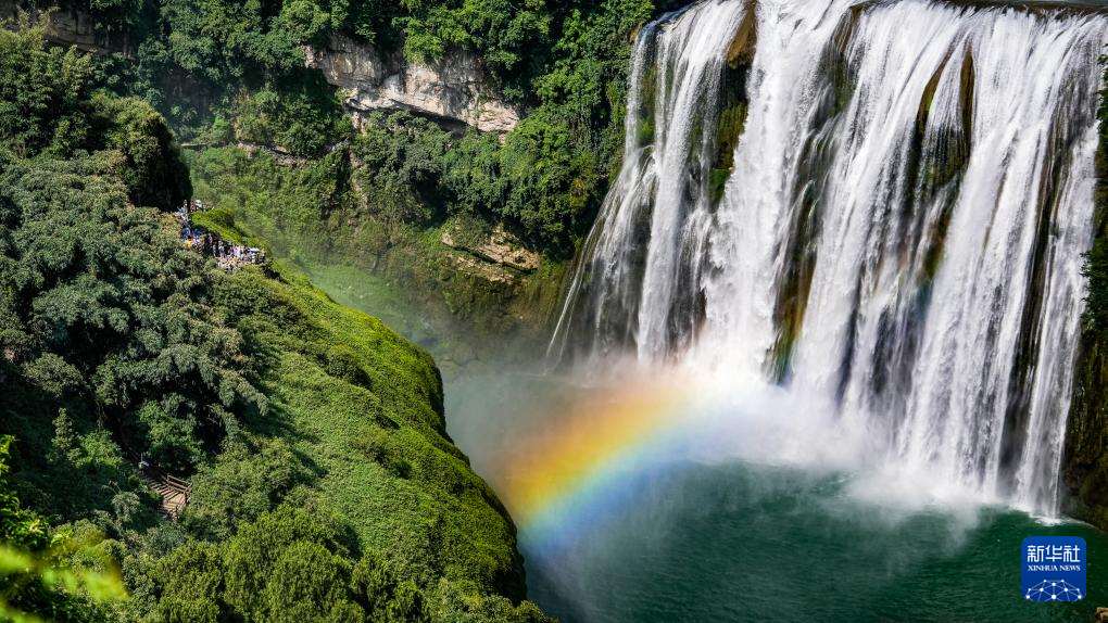 近日,位于贵州省安顺市的黄果树瀑布景区正处于夏日最佳观赏期。黄果树大瀑布水势磅礴,在阳光的照射下,瀑布前架起一道彩虹,美丽的景象吸引各地游客前来观赏游玩。