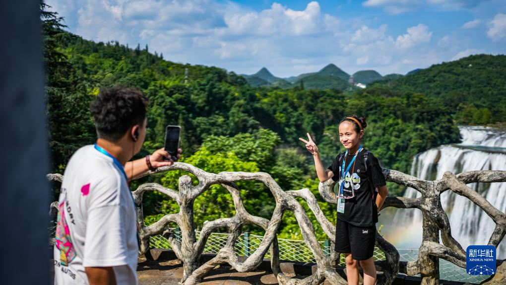 7月16日,游客在贵州省安顺市黄果树瀑布景区留影。新华社记者 陶亮 摄