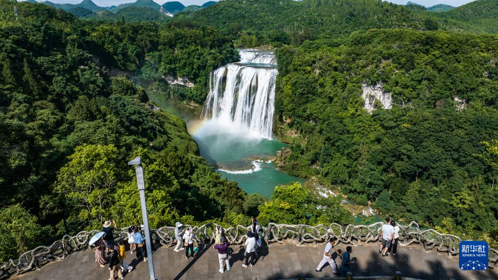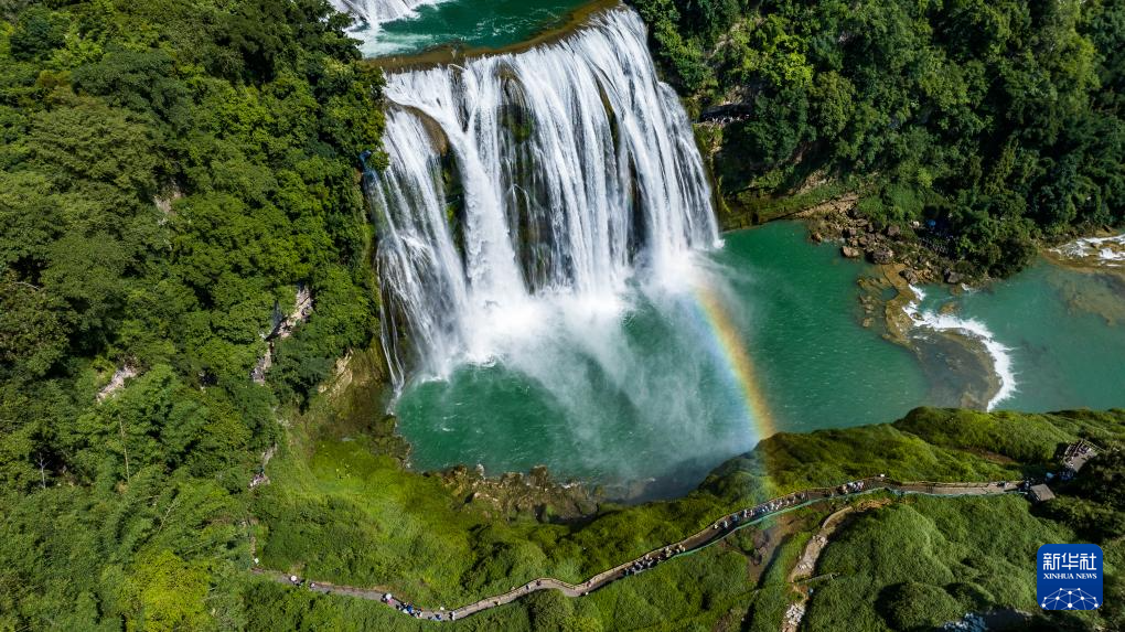 7月16日,游客在贵州省安顺市黄果树瀑布景区游览(无人机照片)。新华社记者 陶亮 摄