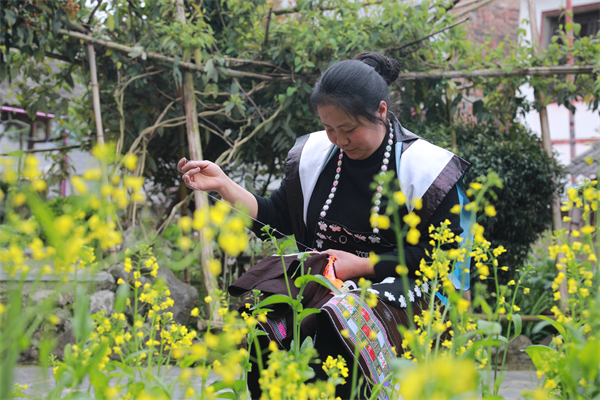 菱角村的苗族妇女几乎人人都会织布、蜡染、刺绣,她们以针当笔,用线为墨,专注地绣着精美的图案;或以铜刀蘸蜡,用布作画,将心中勾勒的美好画面一一呈现。