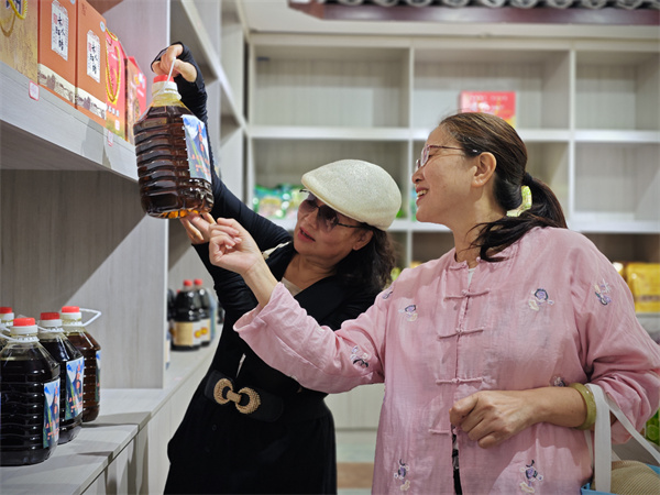 在赤水市葫市镇天鹅堡社区乡村振兴服务站,旅居游客挑选高竹村菜油。(张浪 摄)