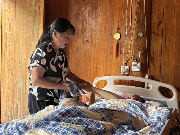 图为周月婵为瘫痪的丈夫擦拭身体。