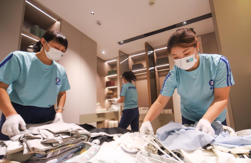 7月2日,田维珊(右)和团队成员在客户家中整理衣物。