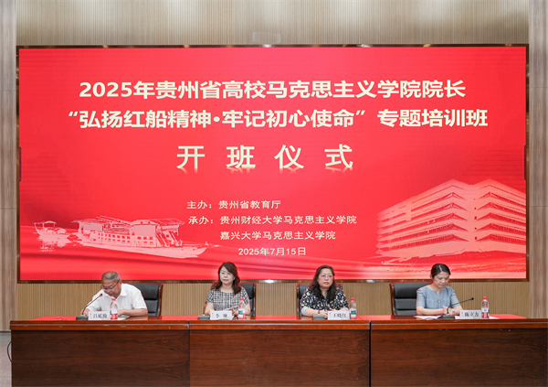 7月15日,由贵州省教育厅主办,贵州财经大学马克思主义学院承办的2025年贵州省高校马克思主义学院院长“弘扬红船精神,牢记初心使命”专题培训班在嘉兴大学顺利开班。贵州省委教育工委学工部部长、省教育厅思政处处长王晓红、贵州财经大学党委副书记李娅、嘉兴大学党委副书记陈立力出席开班仪式并致辞,来自全省70所高校马克思主义学院院长(思政部主任)参加了开班仪式。仪式由嘉兴大学马克思主义学院院长吕延勤主持。