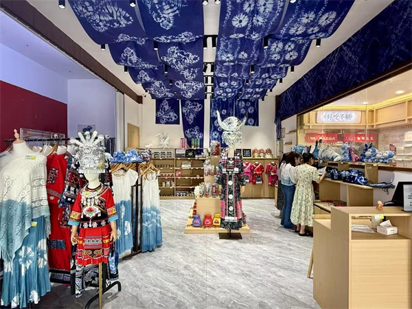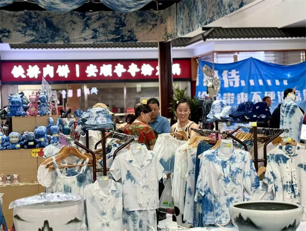 游客在龙宫服务区感受传统蜡染工艺制品。曾静 摄