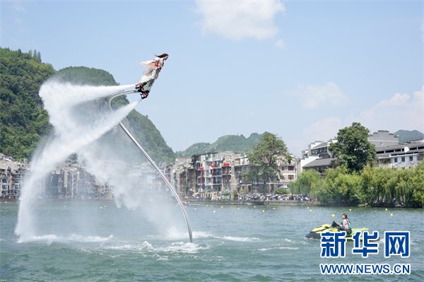 7月19日,表演者在“赛动黔景”2025年贵州省龙舟冠军赛开幕式进行水上表演。新华网发(石建生 摄)