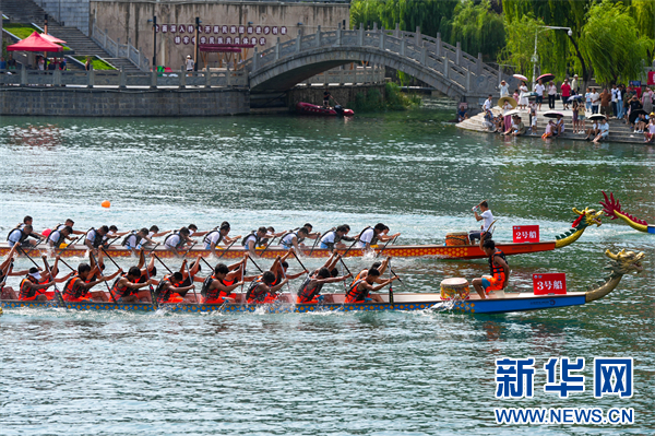 赛事现场,锣鼓声、欢呼声、水浪声不绝于耳,龙舟健儿挥桨竞渡,参赛队员动作规范、挥汗划桨、破浪前行,让围观群众叹为观止。