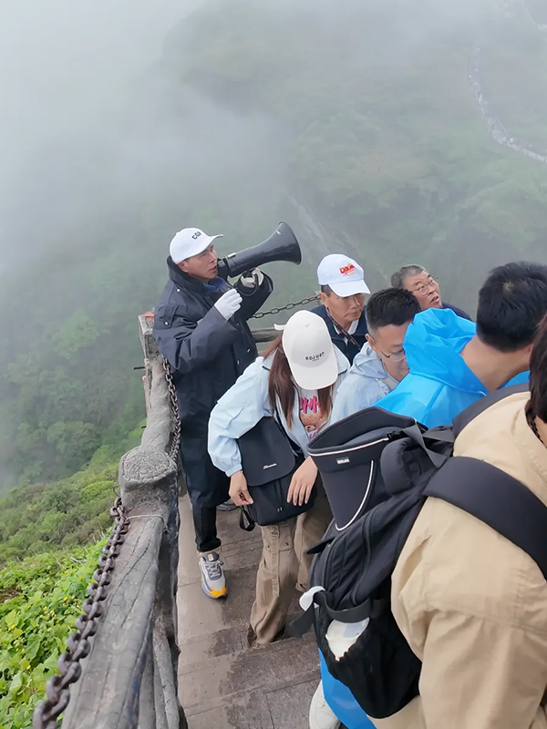 红云金顶的险路上,龙哥的喊话比扶手更让人踏实:“美女加油!你爬的不是山,是自己的坎儿!”风趣的调侃里,藏着他对每段险路的熟稔。但少有人知道,他喊到嗓子冒烟时,只能猛灌凉水——就怕哪句鼓励没送到,有人真的放弃了。