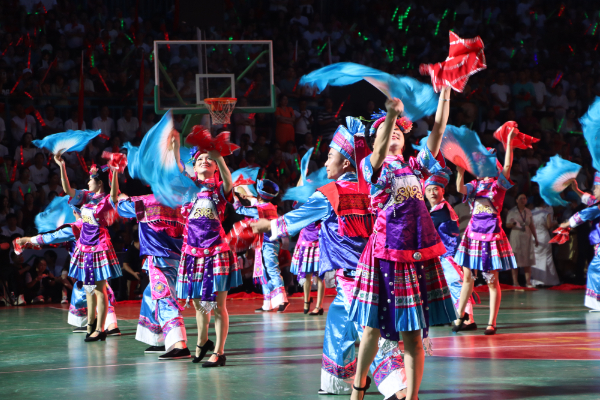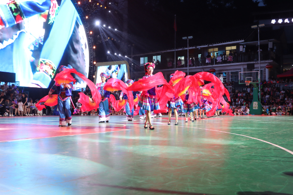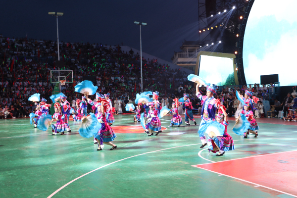 当晚,随着夜幕降临,篮球场上人头攒动,看台处座无虚席。随着一声清亮的山歌划破夜空,独山花灯表演队的演员们身着民族服饰,手持彩扇与罗帕步入场地中央,扇面翻飞间,将传承数百年的民族艺术带到了现代球场,生动诠释了民族文化与现代体育的和谐共鸣。活泼的舞步、欢乐的音乐,让现场观众掌声雷动,纷纷举起手机记录这一文化盛景。