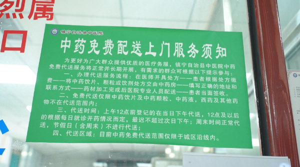 到镇宁自治县中医院就诊的患者只需将中药处方拿到中药房,随后药房会根据处方完成中药煎煮或颗粒调配,最终由医院安排专人专车,按照患者留下的联系电话、送药地址及约定时间将药品送到患者手中。从处方接收至送达手中,每一个环节都彰显责任,每一个步骤都饱含真情。