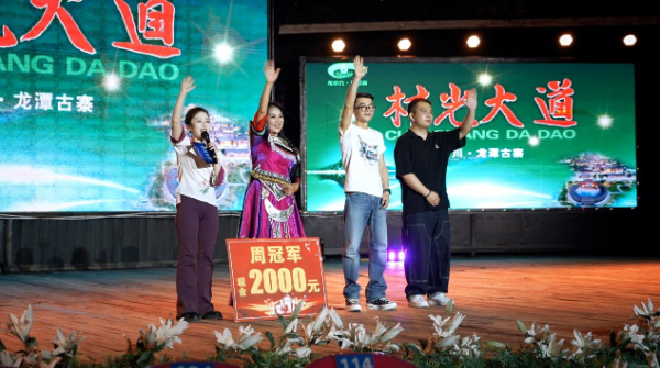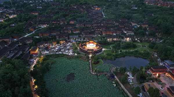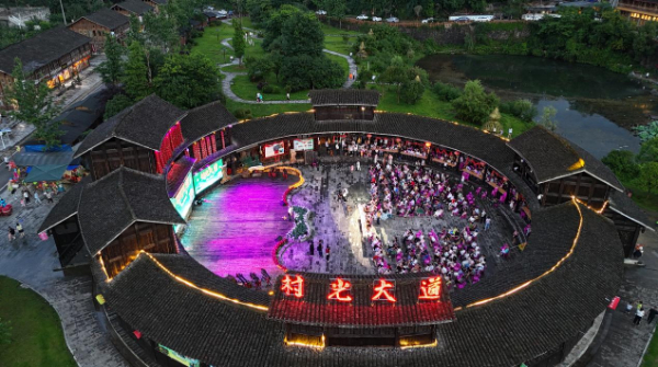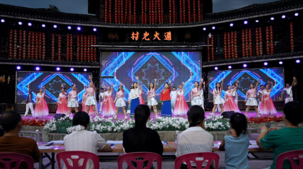 点燃古寨夜晚活力的,是每周六准时上演的“村光大道”文艺演出。九天水榭演武场旁,古色古香的民居店铺在灯光映衬下轮廓清晰;演武场内,百姓舞台气氛热烈,观众台下座无虚席。
