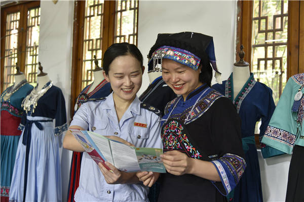 火把节期间,晴隆县税务人员走进“布依垚”服饰商铺,为企业送去“税费大礼包”,讲解税费政策。(刘湘 摄)