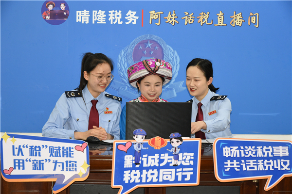 晴隆县税务局“阿妹话税”直播间邀请彝族志愿者参与双语直播,宣传税费优惠政策。(李嘉 摄)