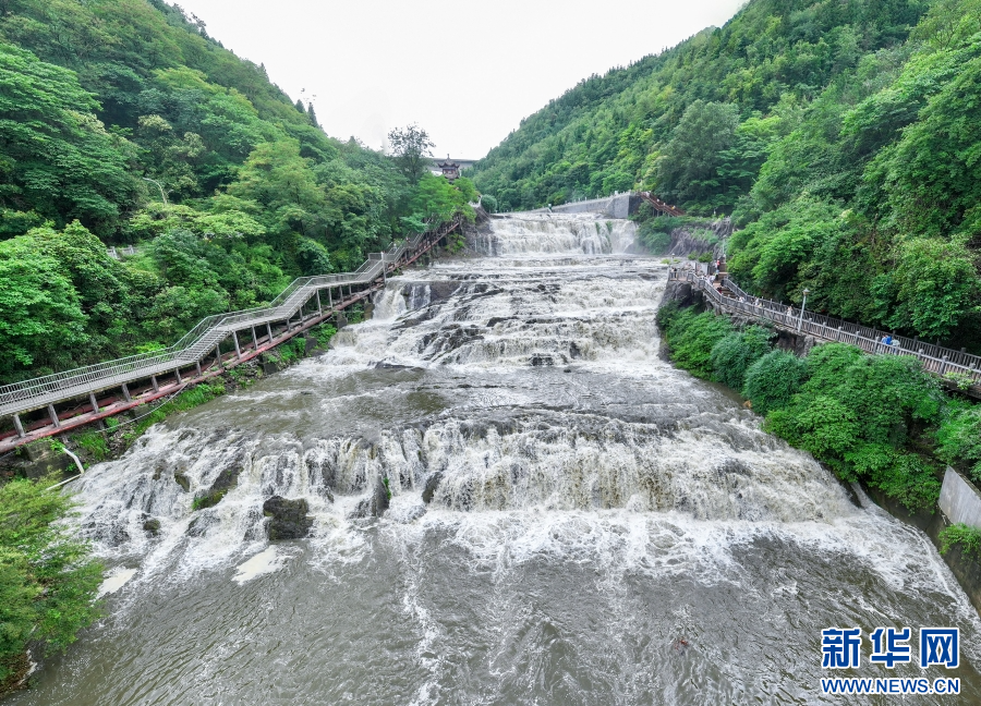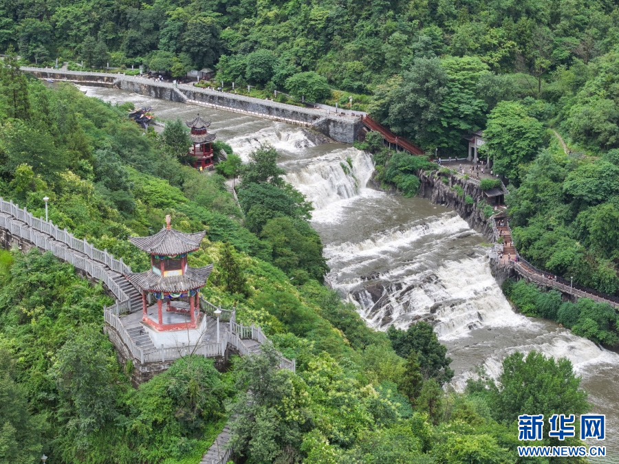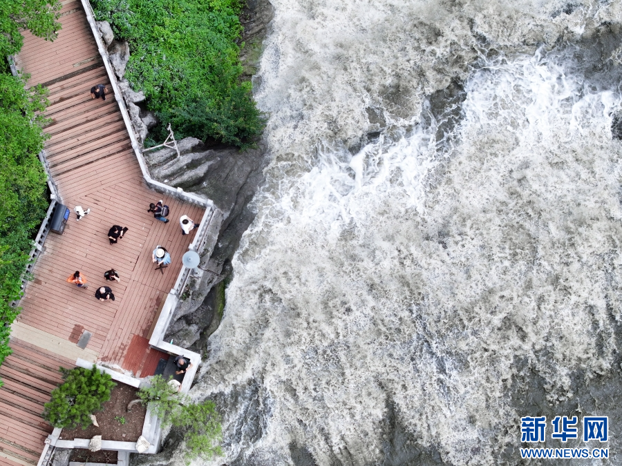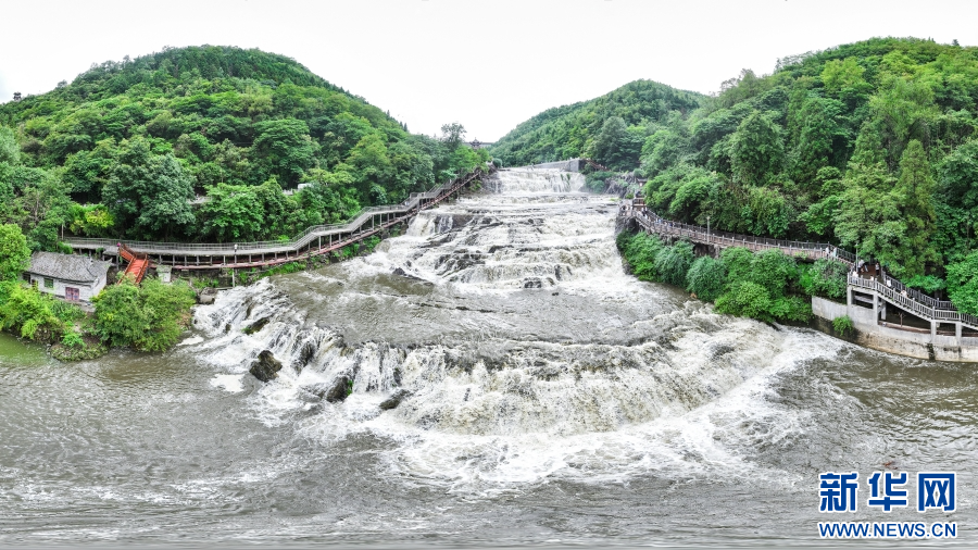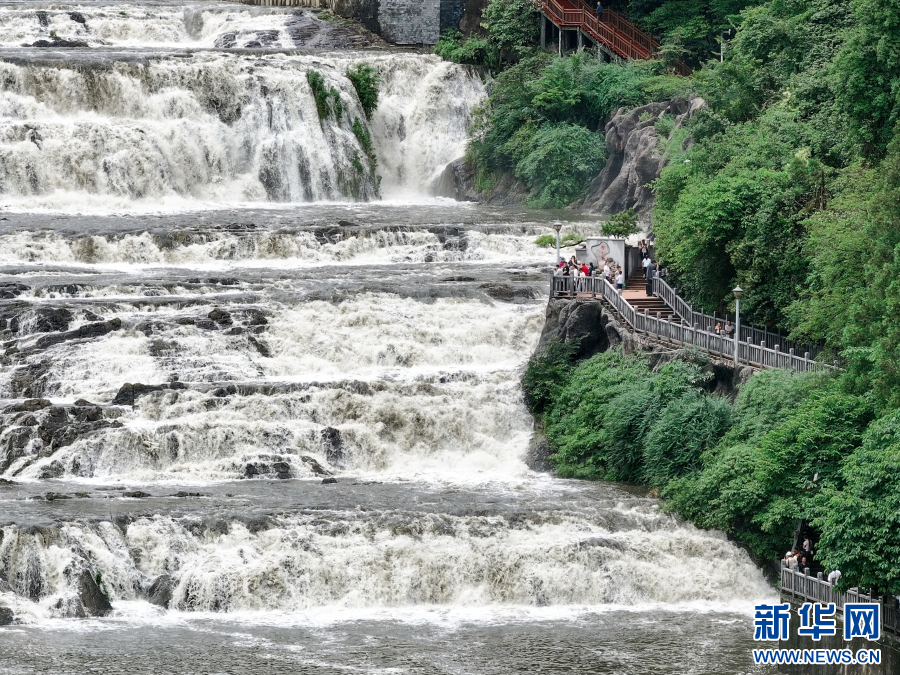 近日,受持续降雨影响,贵州省毕节市七星关区响水滩瀑布水量充沛,河水从滩上倾泻而下,气势磅礴,吸引众多市民和游客前来观赏。响水滩瀑布群由响水滩、龙潭等部分构成,是全国少有的城市市区天然大瀑布。