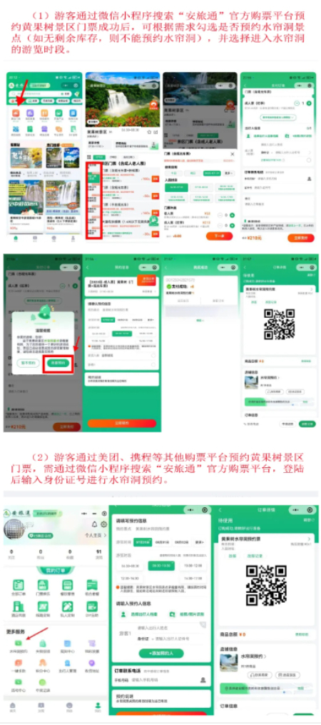 为进一步提升黄果树景区服务质量及游客游览体验,确保游客安全有序游览景区。黄果树景区对水帘洞景点实行实名制预约管理。公告如下: