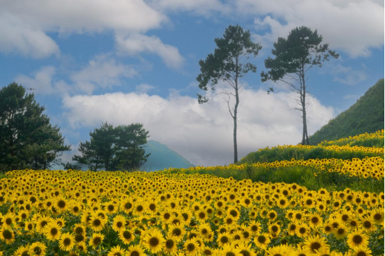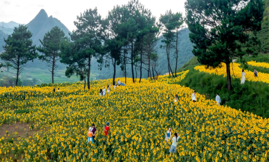 盛夏七月,贵阳市花溪区青岩镇新关村500亩粮油示范田迎来别样风景。昔日撂荒地如今生机盎然,特别是200亩金灿灿的向日葵正值盛花期,吸引众多市民前来观光打卡,田野间呈现美丽热闹景象。