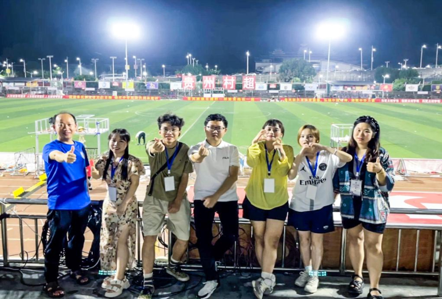 2023年7月,王永杰(左四)与新媒体团队在贵州“村超”球场留影。新华社记者 杨文斌 摄