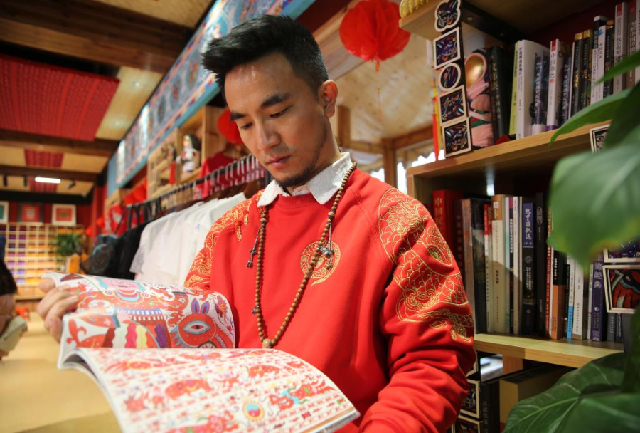 3月29日,贵州“村T”策划人杨春林正在研究服装设计图案。新华社记者 刘续 摄