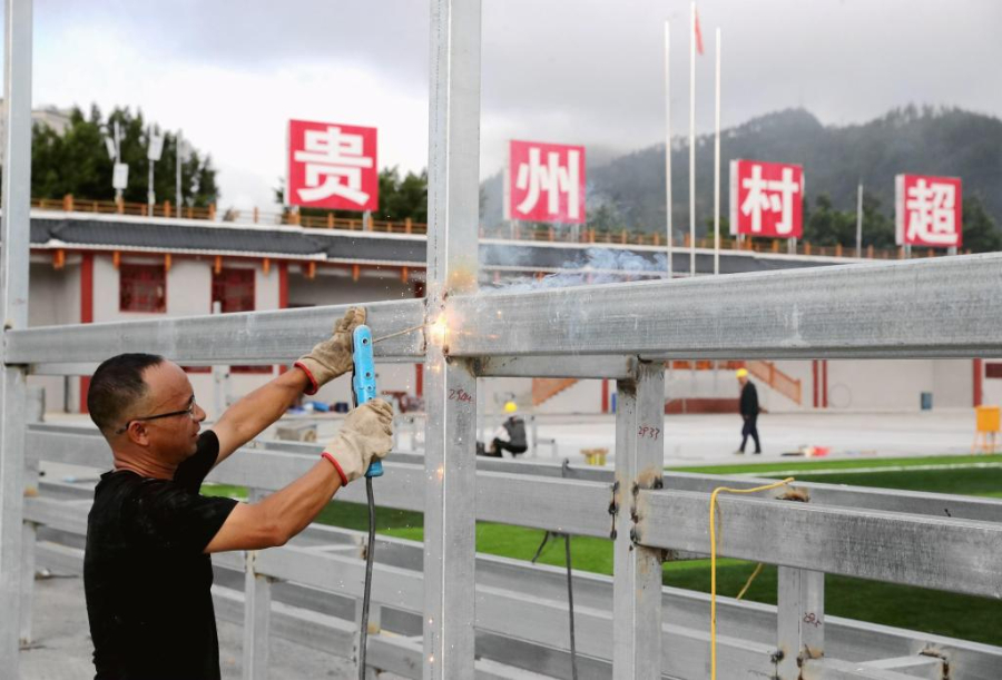 7月15日,工人在贵州“村超”球场焊接观众席位钢架。新华社发(李长华 摄)