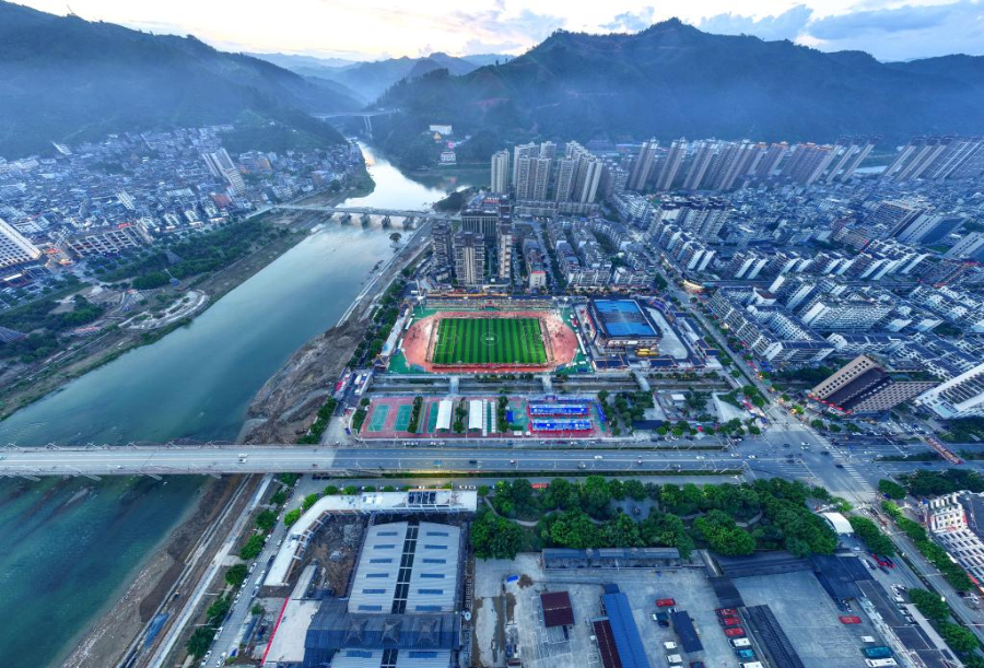 7月25日,洪灾后重建的贵州“村超”球场及榕江县城(无人机照片)。新华社记者 杨文斌 摄