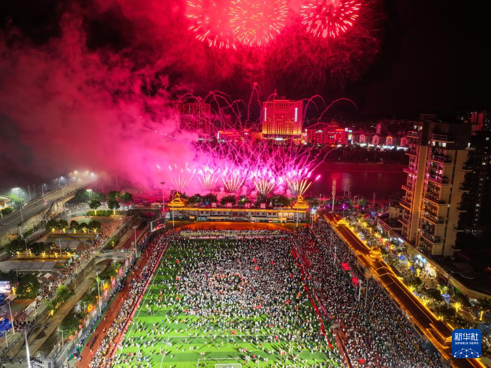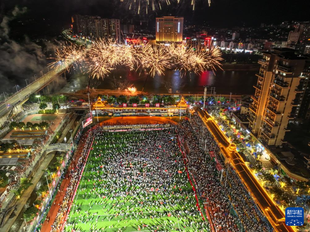 这是7月26日在贵州“村超”球场拍摄的烟花秀(无人机照片)。新华社记者 杨文斌 摄