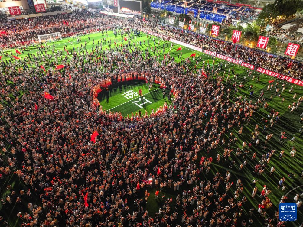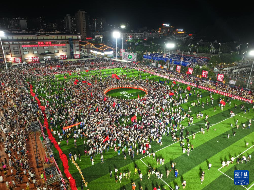 7月26日,活动结束后,人们涌向贵州“村超”球场一起跳民族舞蹈“多耶”(无人机照片)。新华社记者 杨文斌 摄