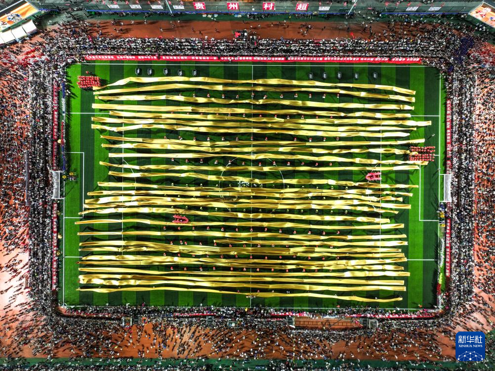 7月26日,人们在贵州“村超”球场表演节目(无人机照片)。新华社记者 杨文斌 摄