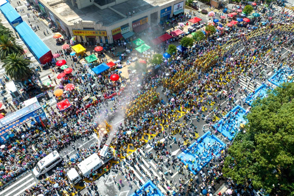 作为节日核心亮点的水龙巡游,今年以“破圈创新”点燃全民热情。传统表演模式被全新升级,县城主街道化身“万人泼水狂欢”的欢乐主场:九条水龙在震天锣鼓中奔腾而至,精壮的汉子们挥舞龙身,时而腾空翻飞、时而盘旋嬉戏,将水龙的灵动与力量演绎得淋漓尽致。巡游队伍中,毛南族打猴鼓舞的铿锵节奏、布依族八音弹唱的悠扬旋律交替上演,身着绚丽民族服饰的演员载歌载舞,生动诠释着平塘各族人民团结奋进的美好图景。活动更打破地域界限,邀请丹寨县、广西河池等地民族表演方阵同台献艺,让民族文化在交流互鉴中绽放异彩。