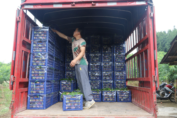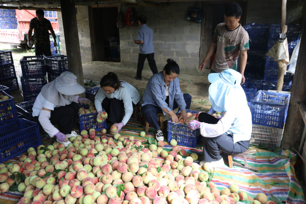 分拣区外的货车旁,来自湖南的客商杨龙正盯着工人装货,手里的订单清单上写满了密密麻麻的数字。“我跟陈文材合作十多年了,这儿的桃儿我放心。”他指着刚装箱的桃子说,“客楼镇海拔高,桃子成熟期比别处晚半个月,正好错开上市高峰,在市场上能卖上好价钱。我直接订单收购,他们不用愁卖,我也能稳定供货,这是双赢”。