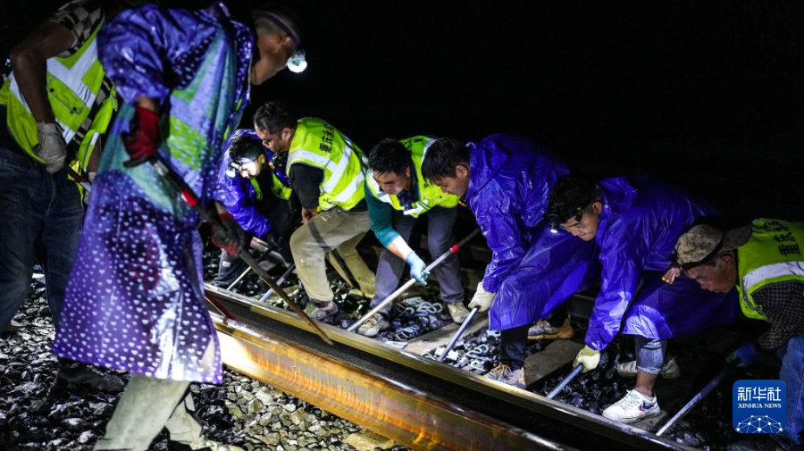 7月30日,工人在内六铁路六盘水梅花山路段进行整修作业。新华社记者 陶亮 摄