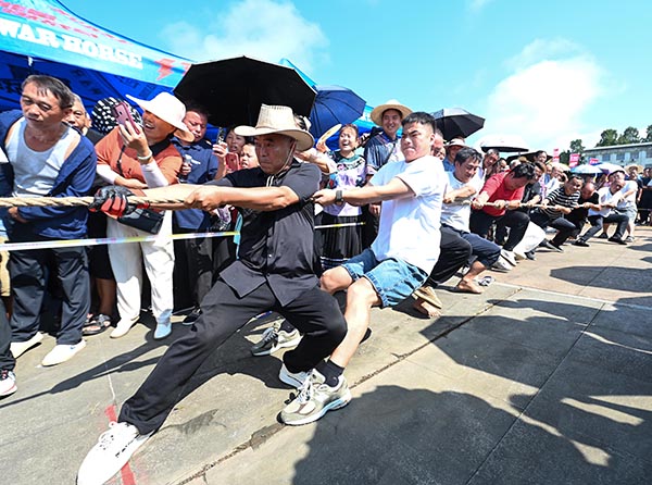 7月30日,松桃苗族自治县长兴堡镇,人们在参加拔河比赛。