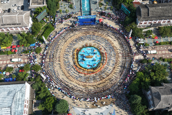 现场,不少游客也被热烈的氛围感染,纷纷加入到舞蹈队伍中,一圈变两圈、两圈变四环,“同心圆”如涟漪般层层荡开,像给大地盛开了巨大的七彩之花。