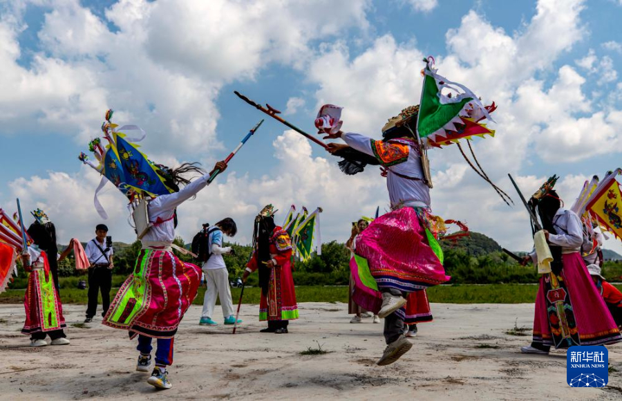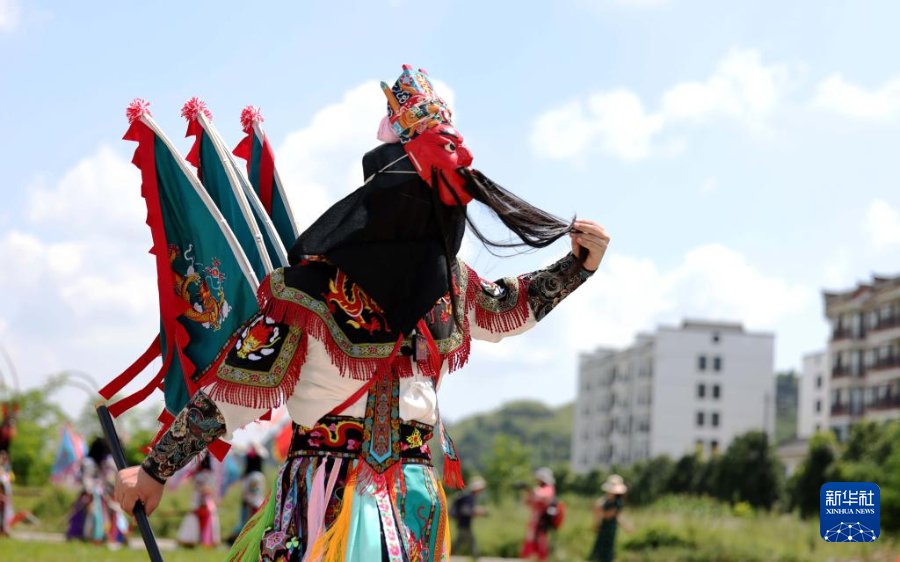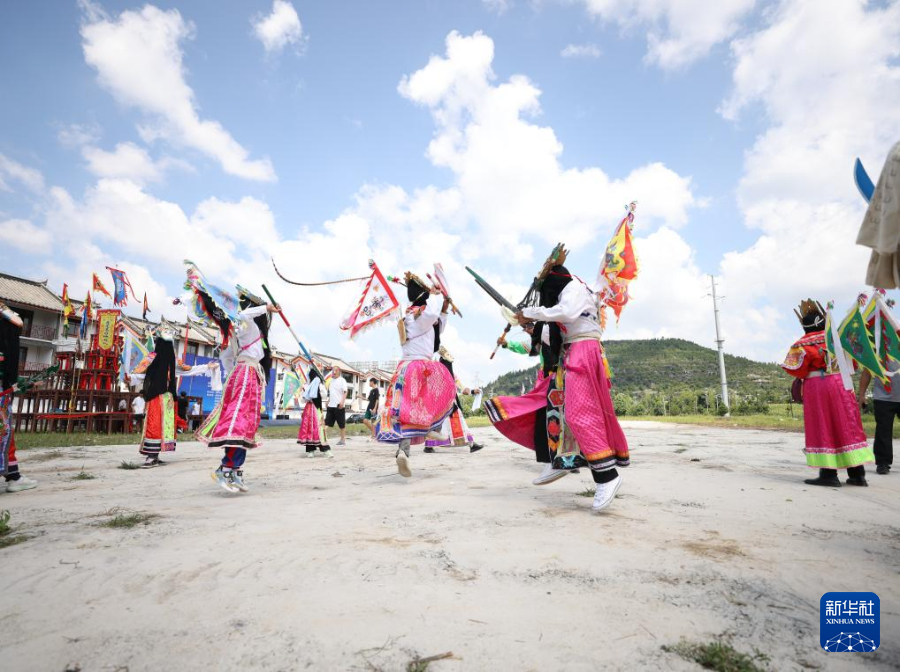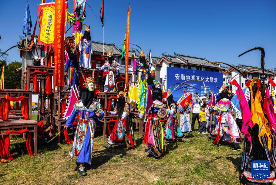 8月2日,地戏艺人在贵州省安顺市西秀区苗岭屯堡古镇开展地戏展演。新华社发(范晖 摄)