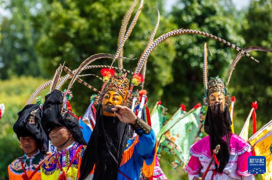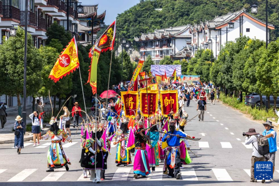 8月2日,地戏艺人在贵州省安顺市西秀区苗岭屯堡古镇开展地戏巡游。新华社发(范晖 摄)