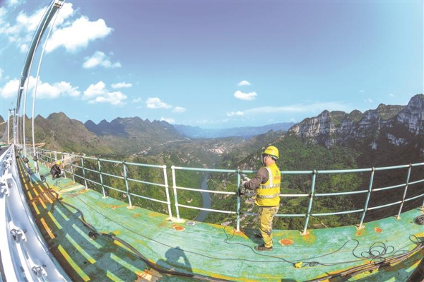 工人在距江面625米的桥面边缘进行围栏除锈打磨作业。贵州日报天眼新闻记者 李枫 摄