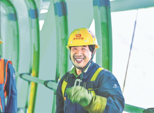 在世界第一高桥钢桁架观光廊道施工的工人露出开心笑容。贵州日报天眼新闻记者 陈慧 摄
