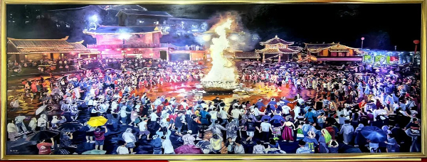 张桂林介绍:“这幅油画以‘民族大团结’为主题来进行创作,聚焦各民族共庆火把节的热闹场景,反映出多元文化的交融。通过大家共庆火把节的自然场景,让观者感受到各民族在文化互动中相互接纳、彼此融入的状态,传递‘火把节照亮的不仅是夜晚,更是心与心的距离’这一深层含义。”