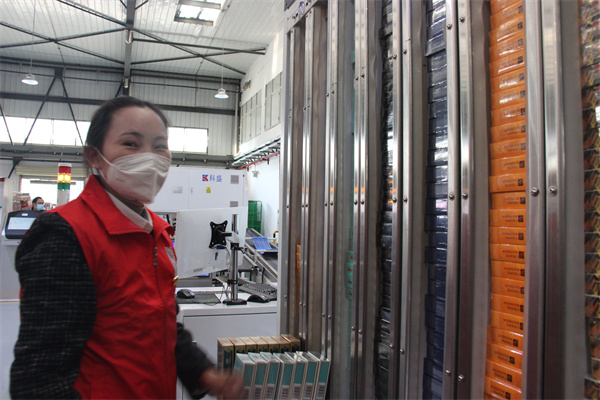 后勤党员支援分拣现场,在立式柜前认真上架卷烟。