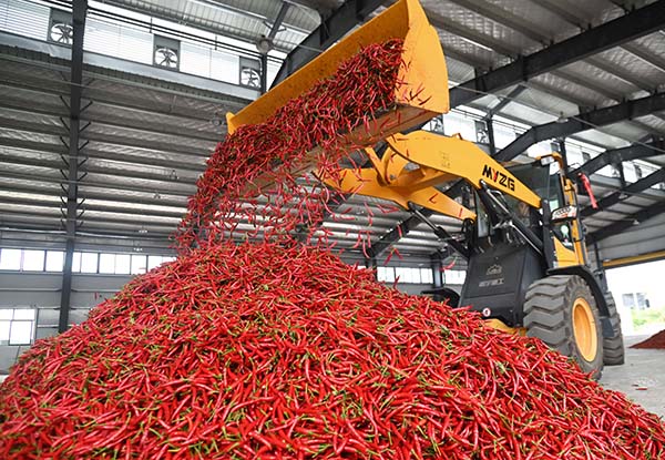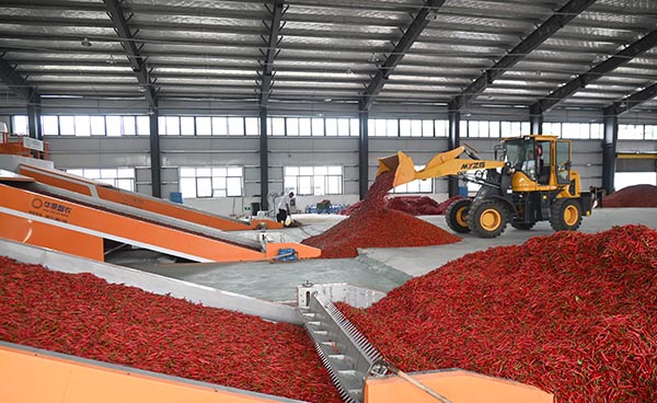在位于太平营街道的强村富民工坊里,堆放着不同品种的辣椒,形成了一个个“辣椒”小山堆,铲车来回穿梭,将鲜椒运送至烘干生产线。同时,各个乡镇的辣椒运输车源源不断地送到工坊,进行过磅称重、质量检测、卸货入库等流程。